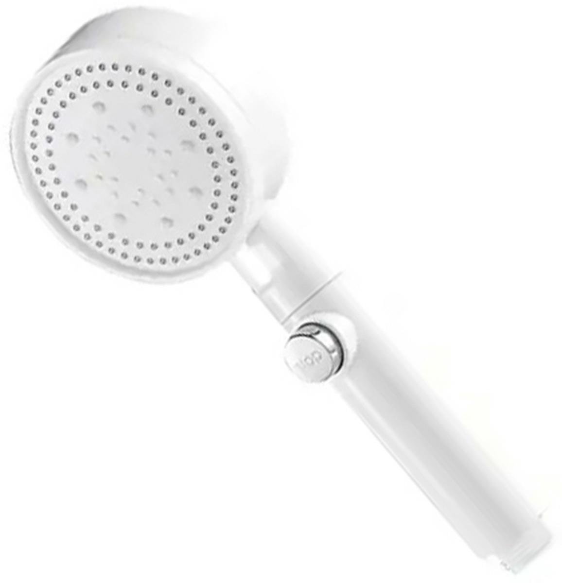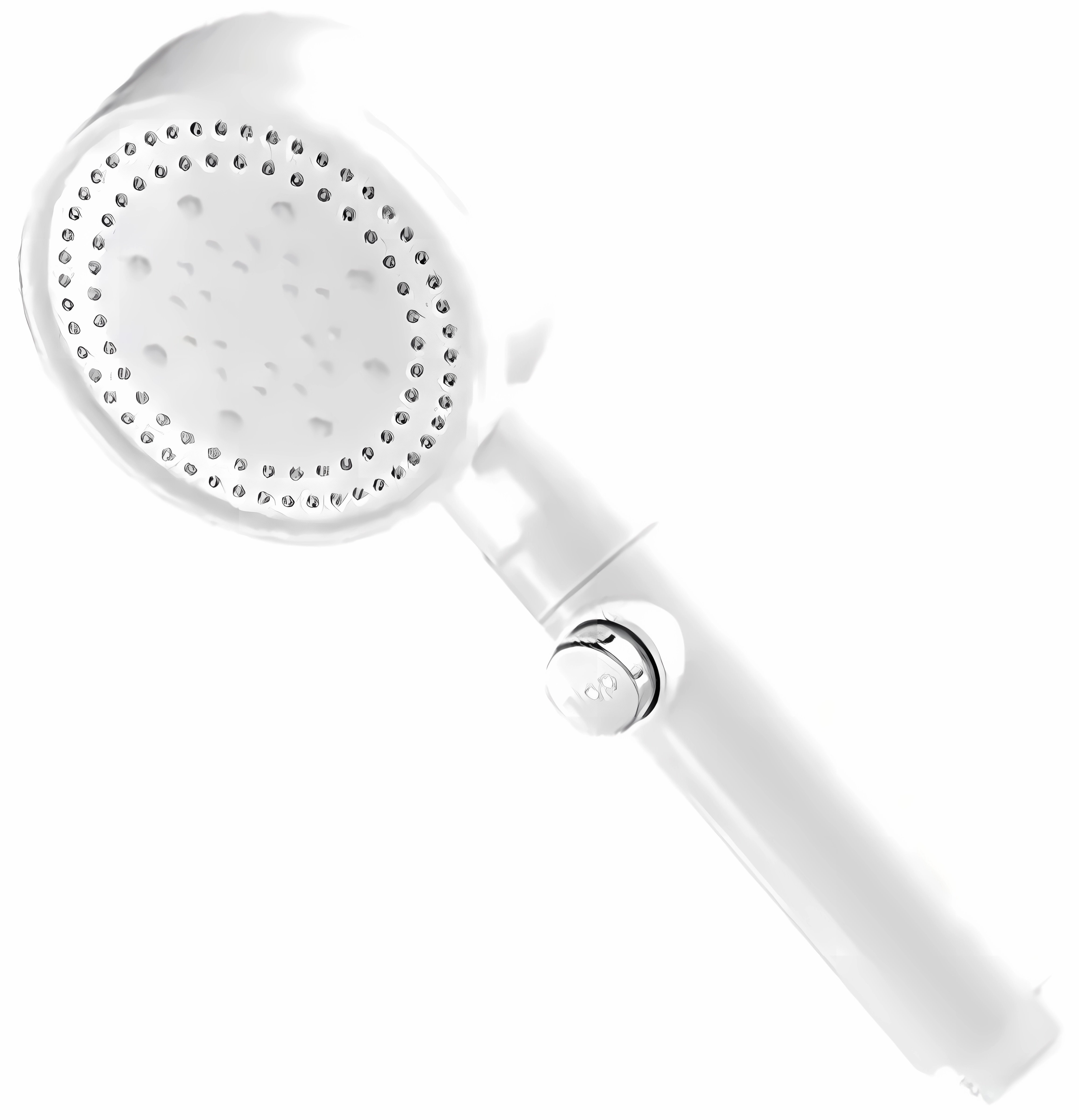 Biela sprchová hlavica. Určené na inštaláciu do štandardnej sprchovej hadice. Hlavica má funkciu voľby režimu sprchovania (5) a funkciu STOP, ktorá zastaví prúd. Vstavaný ventilátor zvyšuje výkon sprchy bez zvýšenia spotreby vody.