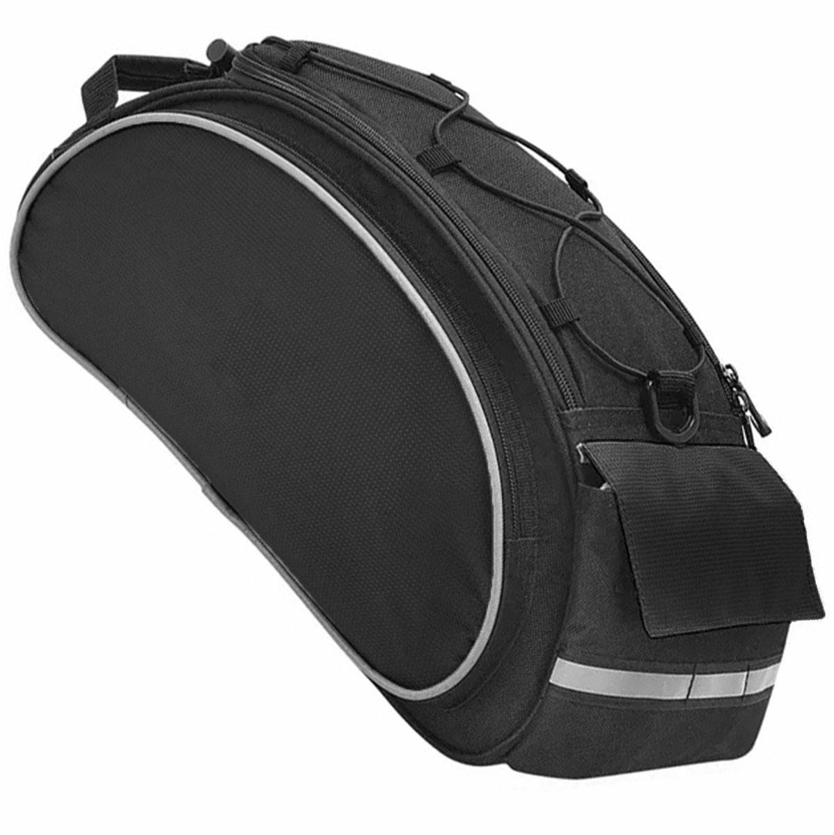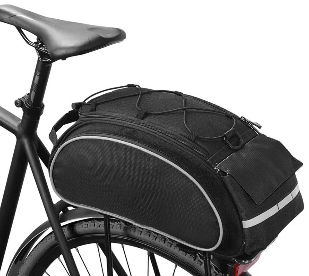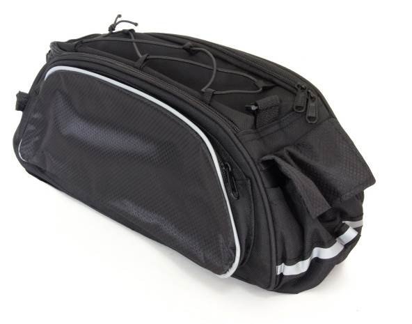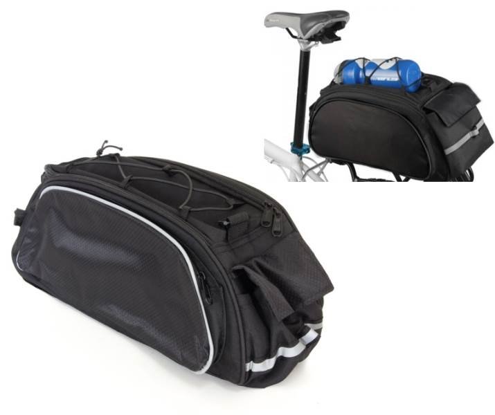 Priestorová taška na bicykel so 4 priehradkami, vyrobená z odolného a ľahko čistiteľného polyesteru odolného voči vode. Mimoriadne užitočná na dlhšie aj kratšie výlety na bicykli. Taška je vybavená priestranným hlavným priestorom s objemom 15 litrov a 3 ďalšími vreckami na zips (dve bočné vrecká na zips a zadné vrecko na suchý zips). Prídavný držiak na fľašu uľahčuje nosenie nápojov so sebou. Taška má aj reflexné prvky, ktoré zvyšujú našu bezpečnosť a zviditeľňujú nás po zotmení. Taška sa pripevňuje na nosič bicykla (na zadnej strane) pomocou popruhov na suchý zips. Vďaka priloženému popruhu a rukoväti ju možno použiť aj ako príručnú tašku - môžete sa teda rozhodnúť, na čo ju chcete použiť.