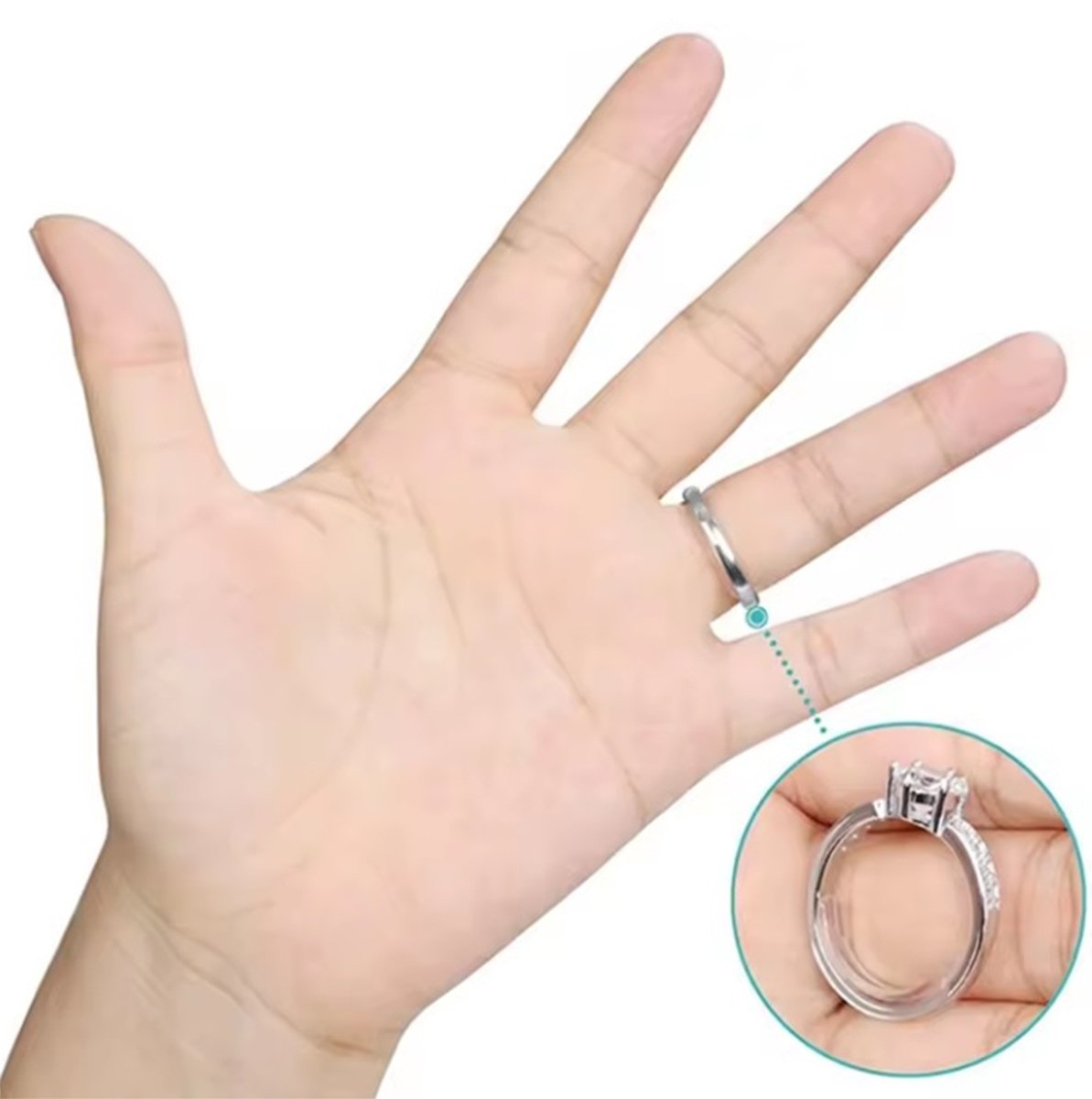Neviditeľný regulátor veľkosti prsteňa - sada 8 ks. Produkt, ktorý umožňuje rýchle prispôsobenie prsteňa obvodu vášho prsta. Nevyžaduje drahé zmenšovanie ani návštevu klenotníka. Transparentný silikón dokonale priľne k prstu a pod šperkami je neviditeľný. Súprava obsahuje až 8 rôznych šírok (od 2 do 9,5 mm).