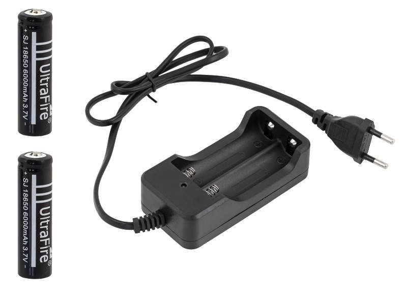 Súčasťou balenia sú aj 2x nabíjacie priemyselné výkonné batérie 4,2 V 18650 UltraFire 4800mAh.
