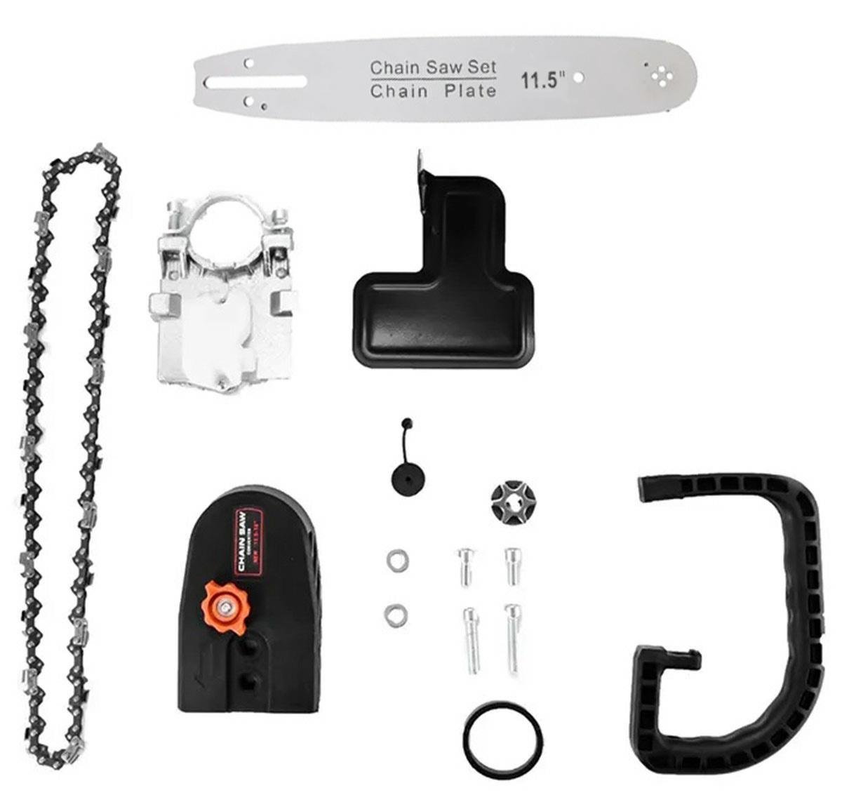 Nadstavec na uhlovú brúsku - reťazová píla. Mimoriadne praktická vychytávka, ktorá z vašej brúsky urobí šikovnú motorovú pílu. Prevodník sa montuje do objímky brúsky ako klasický kotúč. Pohodlná, zaoblená rukoväť zaisťuje vysoký komfort práce. Špeciálny kryt za reťazou zvyšuje bezpečnosť pri používaní.