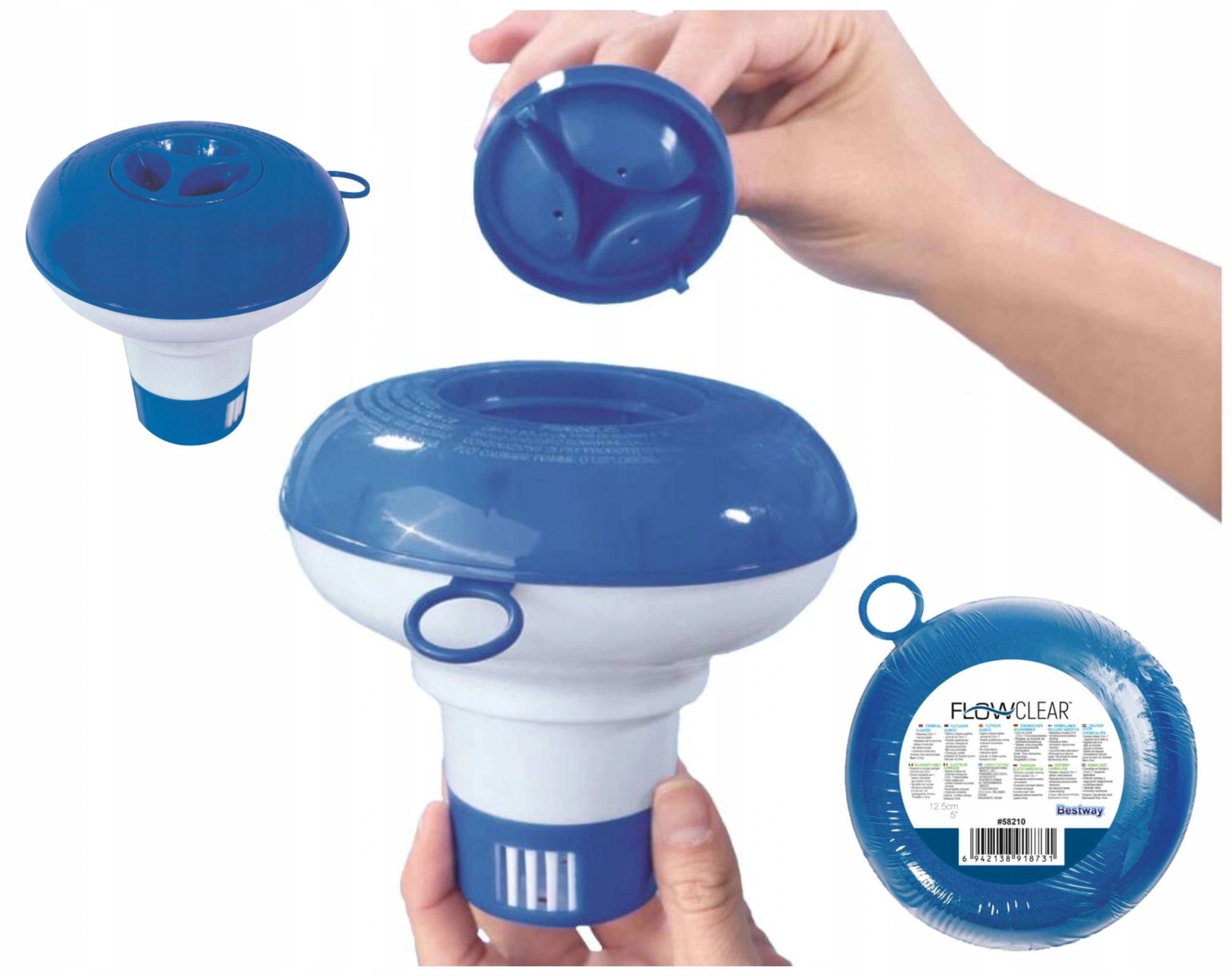 Plávajúci plastový dávkovač s regulačnou mriežkou pre chlórové tablety. - veľkosť 12,7 cm