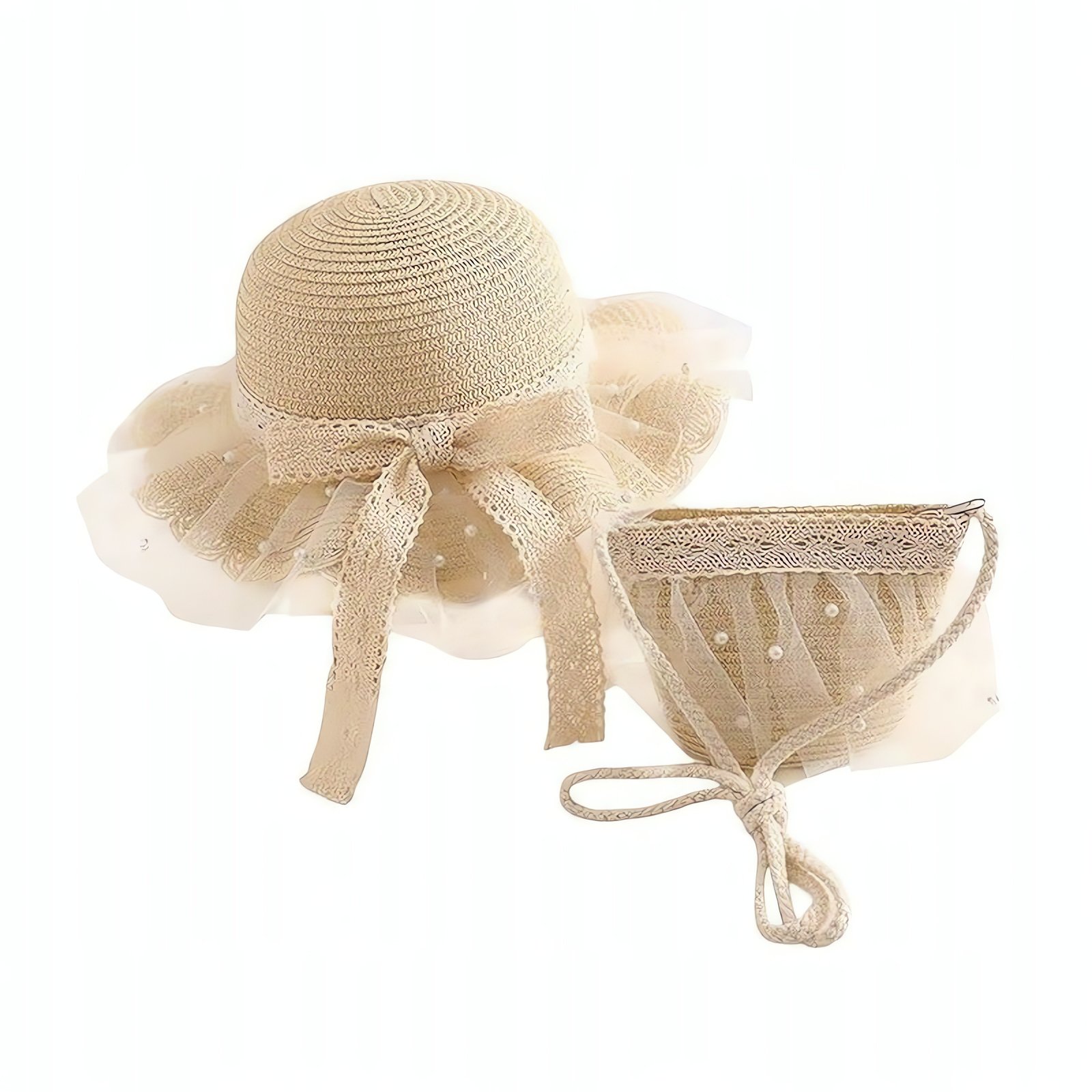 Taška a klobúk pre dievča s dĺžkou 52 cm je dokonalým módnym doplnkom na letné mesiace. Táto súprava kombinuje slamený klobúk a tašku zdobenú tylom a perlami.