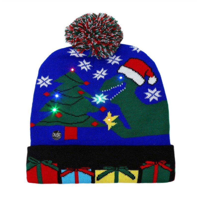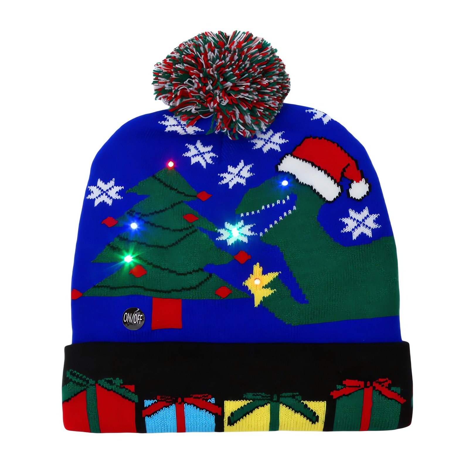 Vianočná zimná čiapka s LED svetlami. Čiapka v modernom dizajne s bambulou a vianočnými darčekmi okolo spodného lemu. Integrované LED svetlá vytvárajú blikajúci efekt, ktorý dodá slávnostnú atmosféru na večierku, vonkajšej akcii alebo vianočnom stretnutí. Ideálna ako originálny darček alebo doplnok k vianočnému outfitu.
