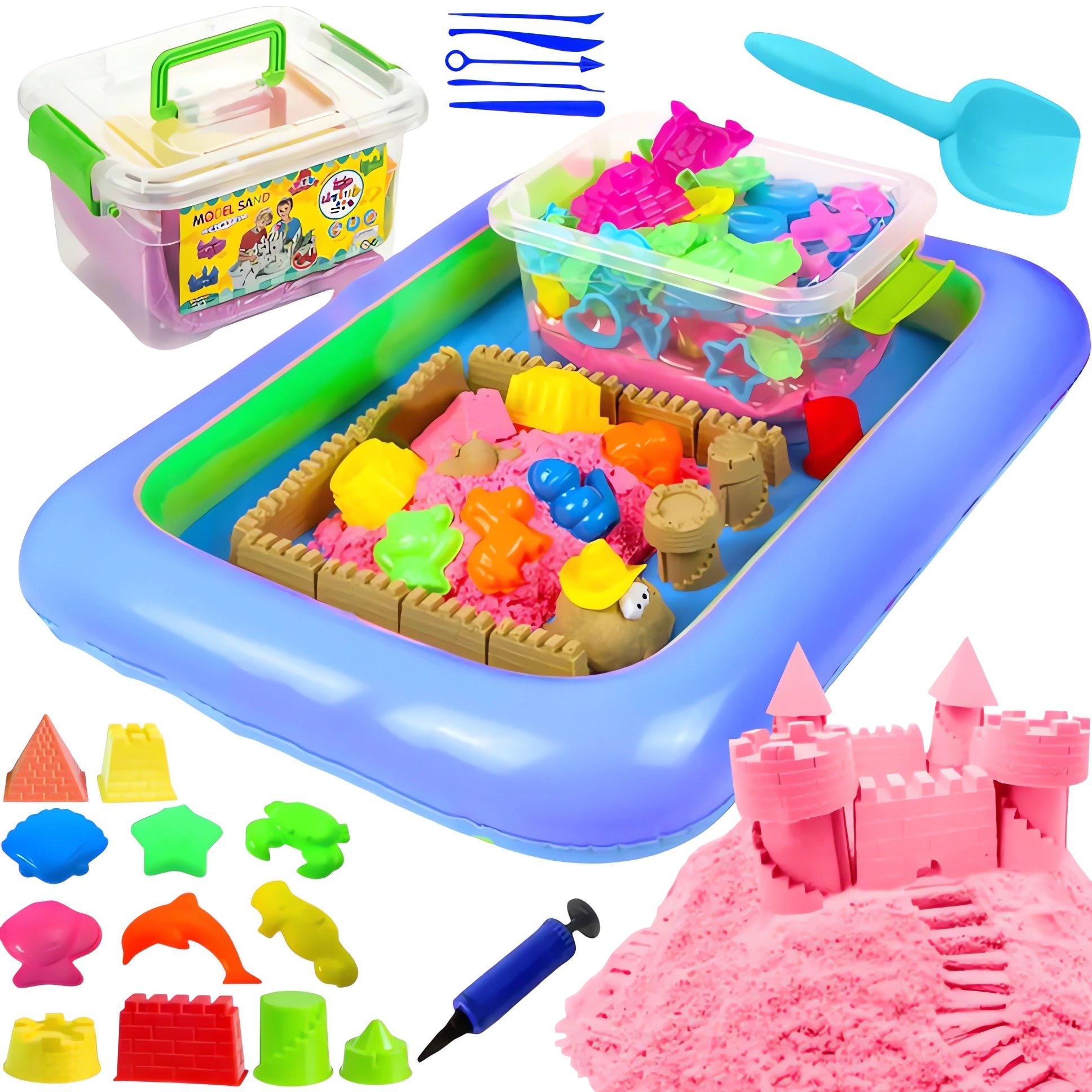 Každá samostatná súprava obsahuje až 2 kg piesku v jednej farbe podľa vášho výberu. To umožňuje vytvárať veľké budovy s detailnými prvkami a výrazne rozširuje možnosti hry. Sada obsahuje nafukovací obdĺžnikový bazén, ktorý sa po nafúknutí zmení na pieskovisko pripravené na naplnenie kinetickým pieskom. Vďaka okrajom sa nešmýka po podlahe, keď sa v ňom hrá fascinované dieťa. Súčasťou súpravy sú farebné formičky, vďaka ktorým si dieťa ľahko postaví hrad alebo zrealizuje tie najkreatívnejšie nápady. Špecifikácie: