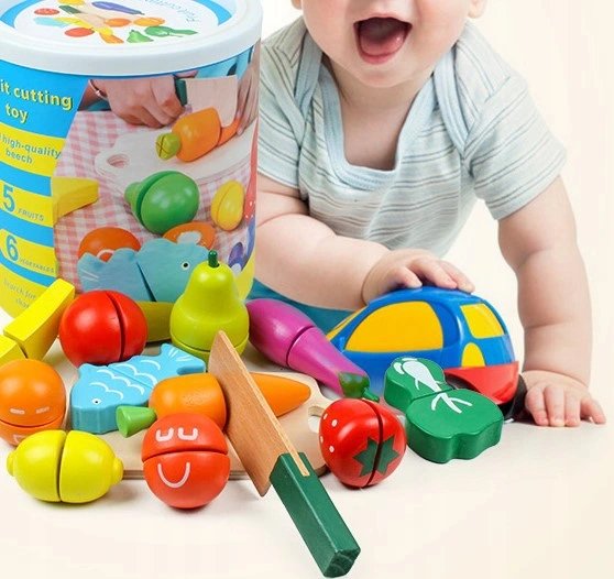 Súprava farebné zeleniny a ovocia v vedre je skvelým doplnkom zábavy pre malých kuchárov, ktorí si radi hrajú doma, v obchode alebo pri varení.