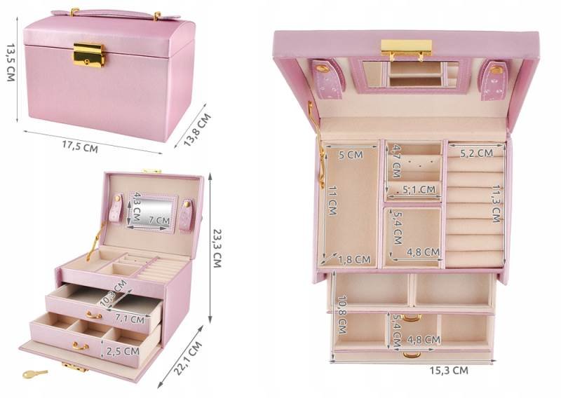Táto luxusná šperkovnica ponúka celý rad možností ukladania. Je ideálny pre ukladanie hodiniek, náhrdelníkov, náušníc, náramkov, prsteňov a ďalších druhov šperkov a bižutérie. Vďaka svojej praktickosti a prehľadnosti budete mať svoje doplnky vždy dokonale uložené a organizované a ich čistenie a prenášanie bude maximálne pohodlné.