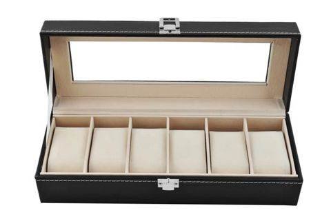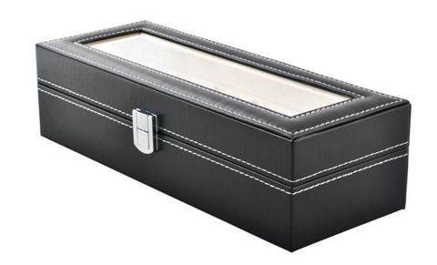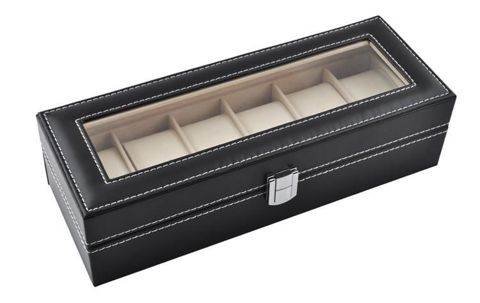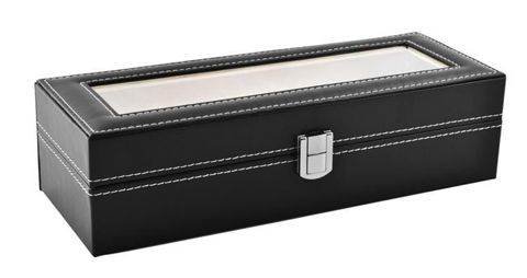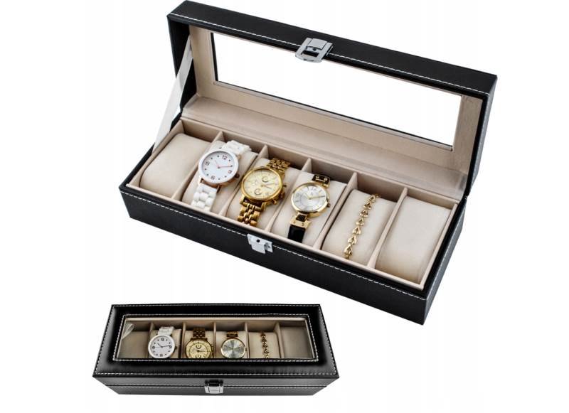 Elegantné puzdro pre uskladnenie alebo vystavenie hodiniek, náramkov a ďalšie šperky. Vnútorné priehradky na 6 ks hodiniek. Uzavretie na zámok na kľúčik.