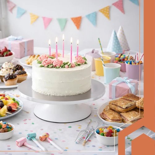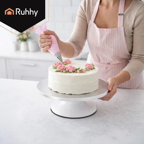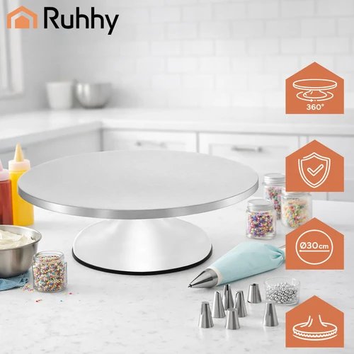 Otáčanie o 360° umožňuje otáčať dezert bez prerušenia práce a udržať jednotnú vrstvu zdobenia po celom obvode. Protiskluzová základňa zaisťuje istotu a stabilitu aj pri väčšom zaťažení, takže podstavec sa nepohne ani na hladkej kuchynskej linke. Maximálna nosnosť až 20 kg poskytuje dostatočnú rezervu pre viacposchodové torty alebo ťažšie dezerty.