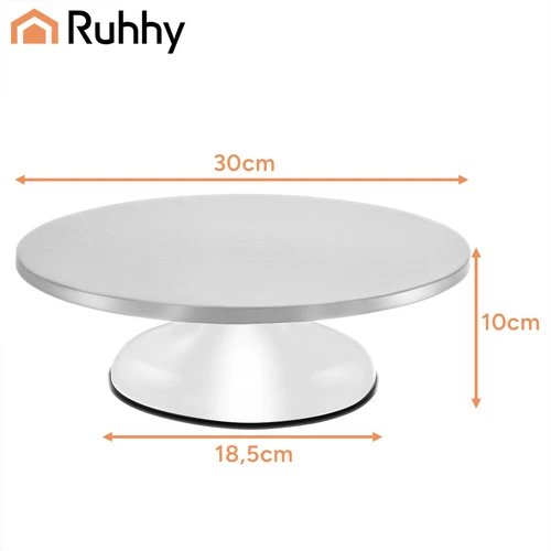 Kombinácia materiálov (nehrdzavejúca oceľ + PP + TPR) spája odolnosť, dlhú životnosť a jednoduchú údržbu. Nerezová doska sa ľahko čistí a šetrí čas po dokončení práce. Priemer dosky 30 cm je ideálny pre väčšinu bežných tortových foriem, výška 9,5 cm poskytuje pohodlnú pracovnú polohu a priemer základne 18,5 cm podporuje stabilitu celku.