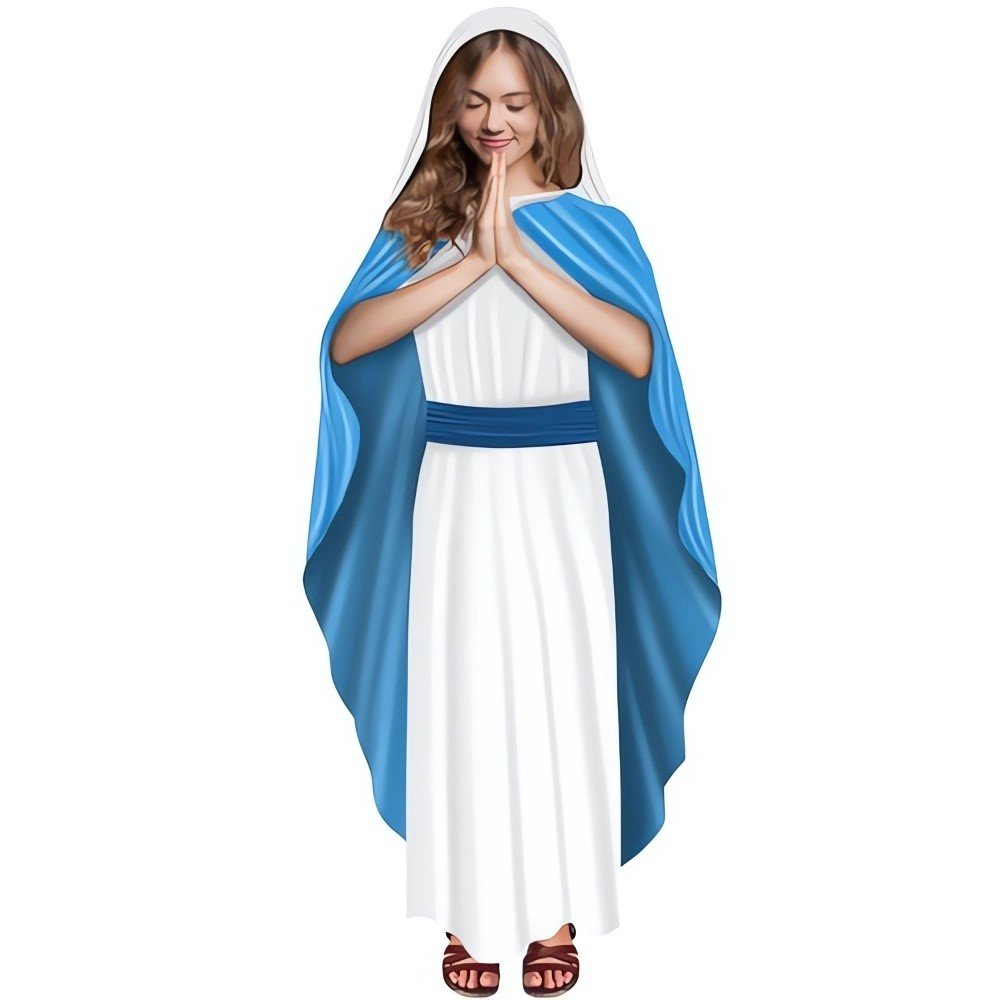 Tento krásny kostým Márie obsahuje dlhé biele šaty po zem, opasok a pokrývku hlavy.