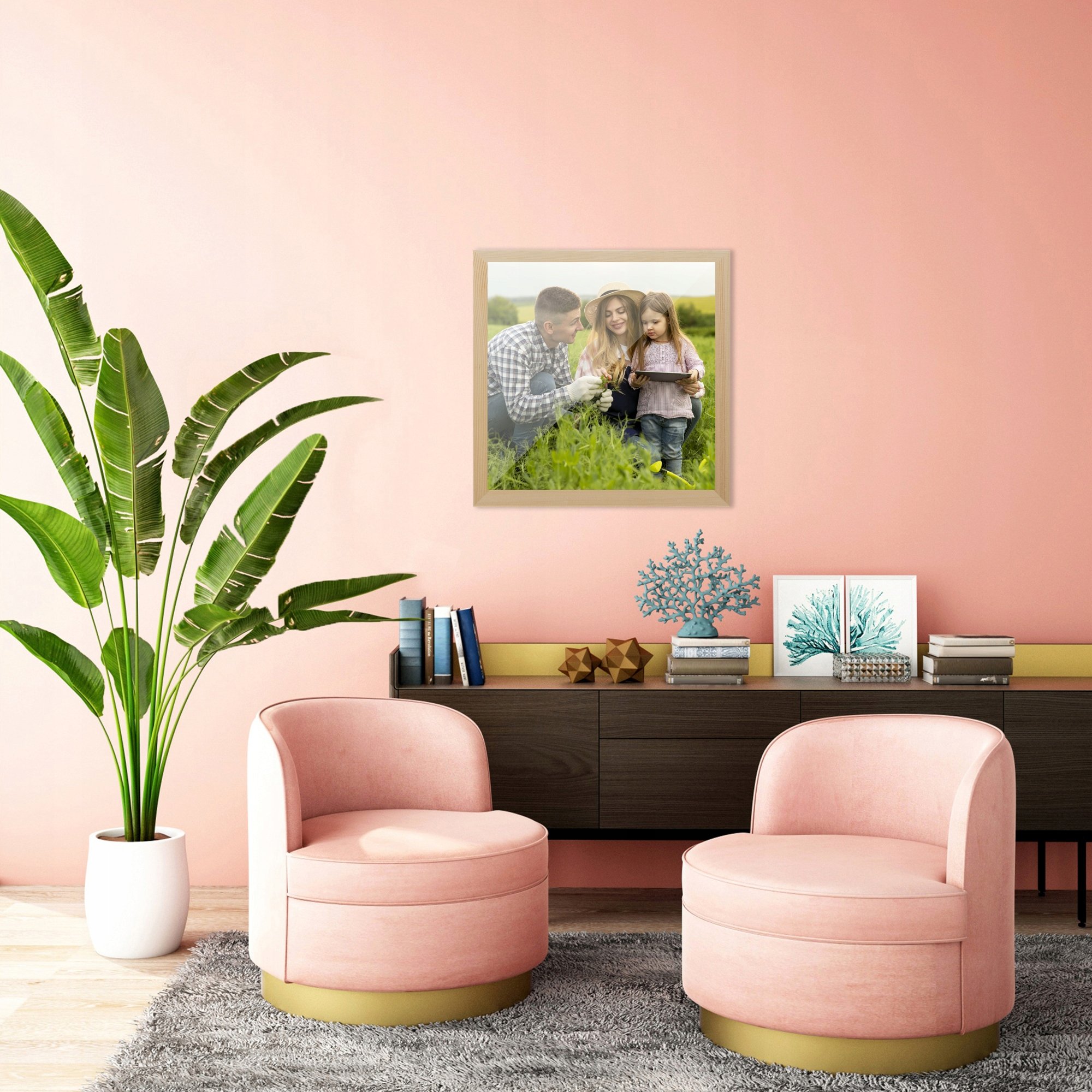 Rám je vyrobený z masívneho a odolného borovicového dreva, vďaka čomu dodáva zarámovaným fotografiám a plagátom triedu. Predná strana rámu je vyrobená z ľahkého a nerozbitného plexiskla chráneného z oboch strán ochrannou fóliou. Má vešiaky, ktoré umožňujú zavesiť rám na stenu zvisle alebo vodorovne. >vonkajšie rozmery: 25x25 cm