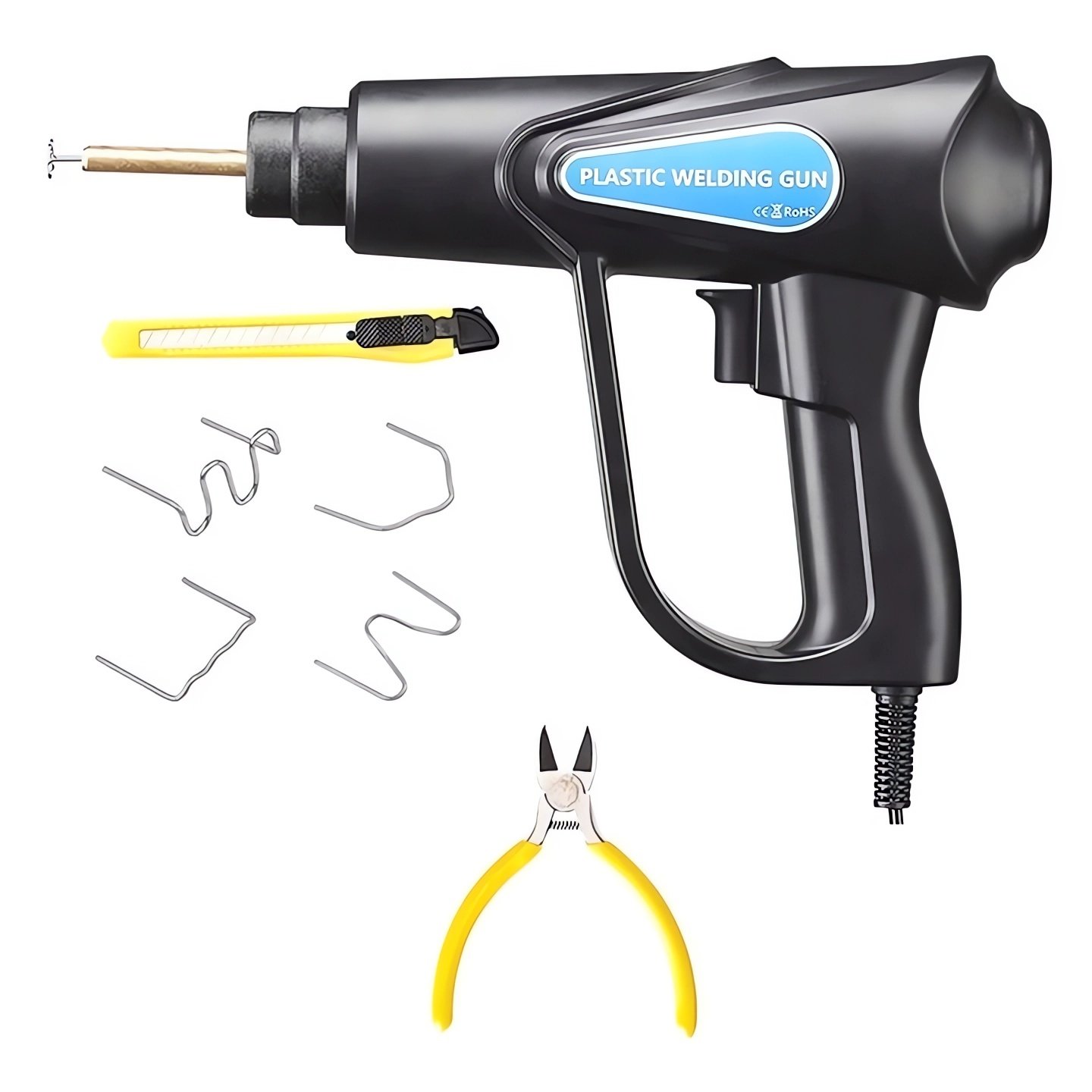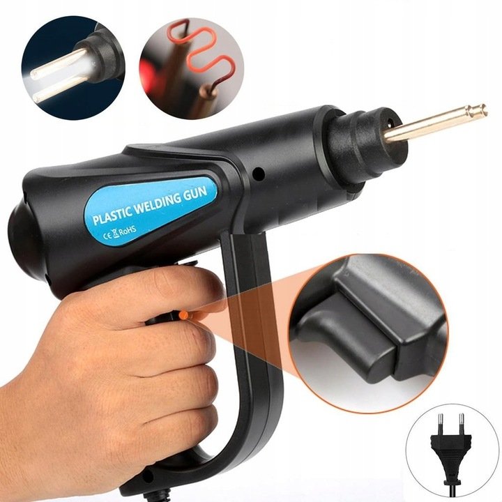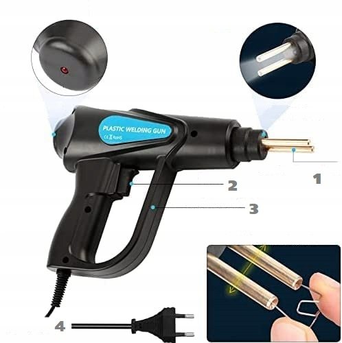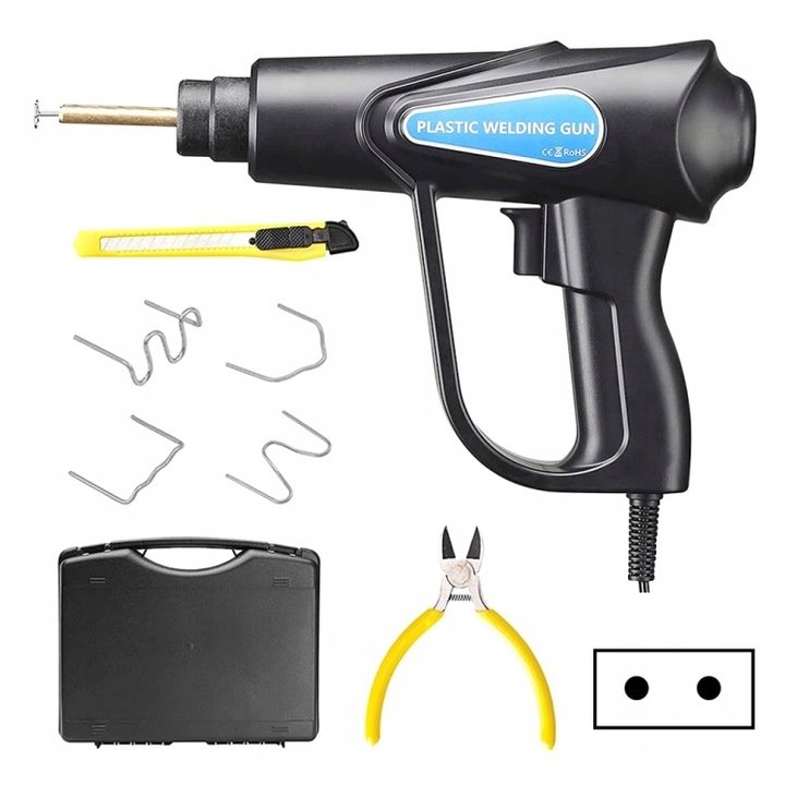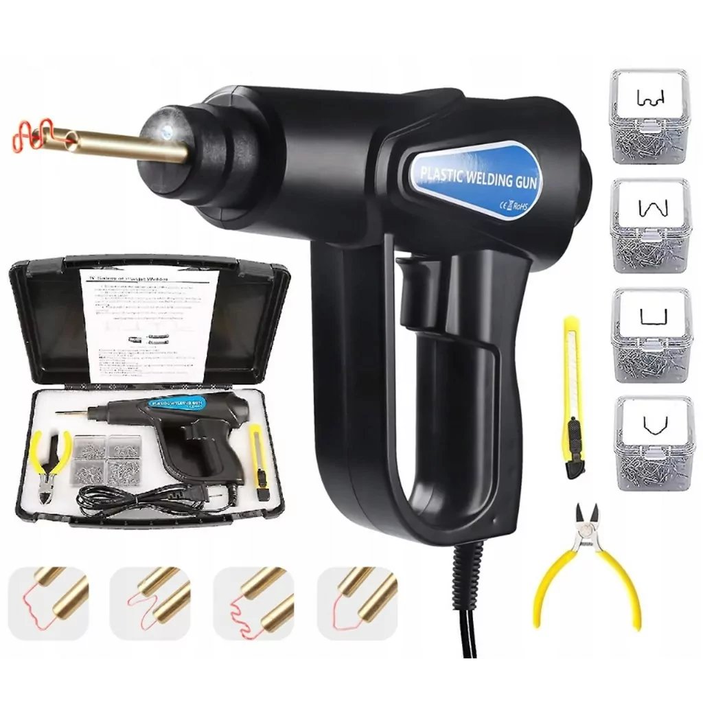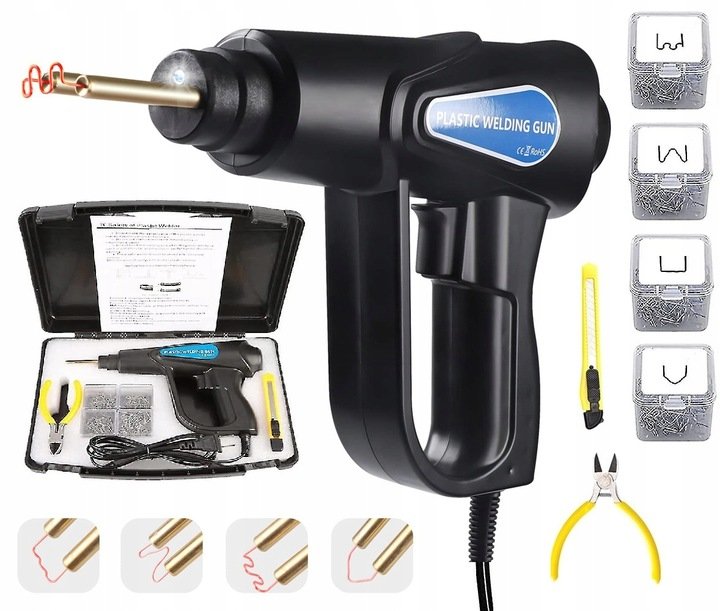 Kompaktná zváračka plastov. Sada obsahuje 200 oceľových spôn na plast (4 druhy po 50 ks) a ďalej nôž a kliešte na lisovanie plastov.