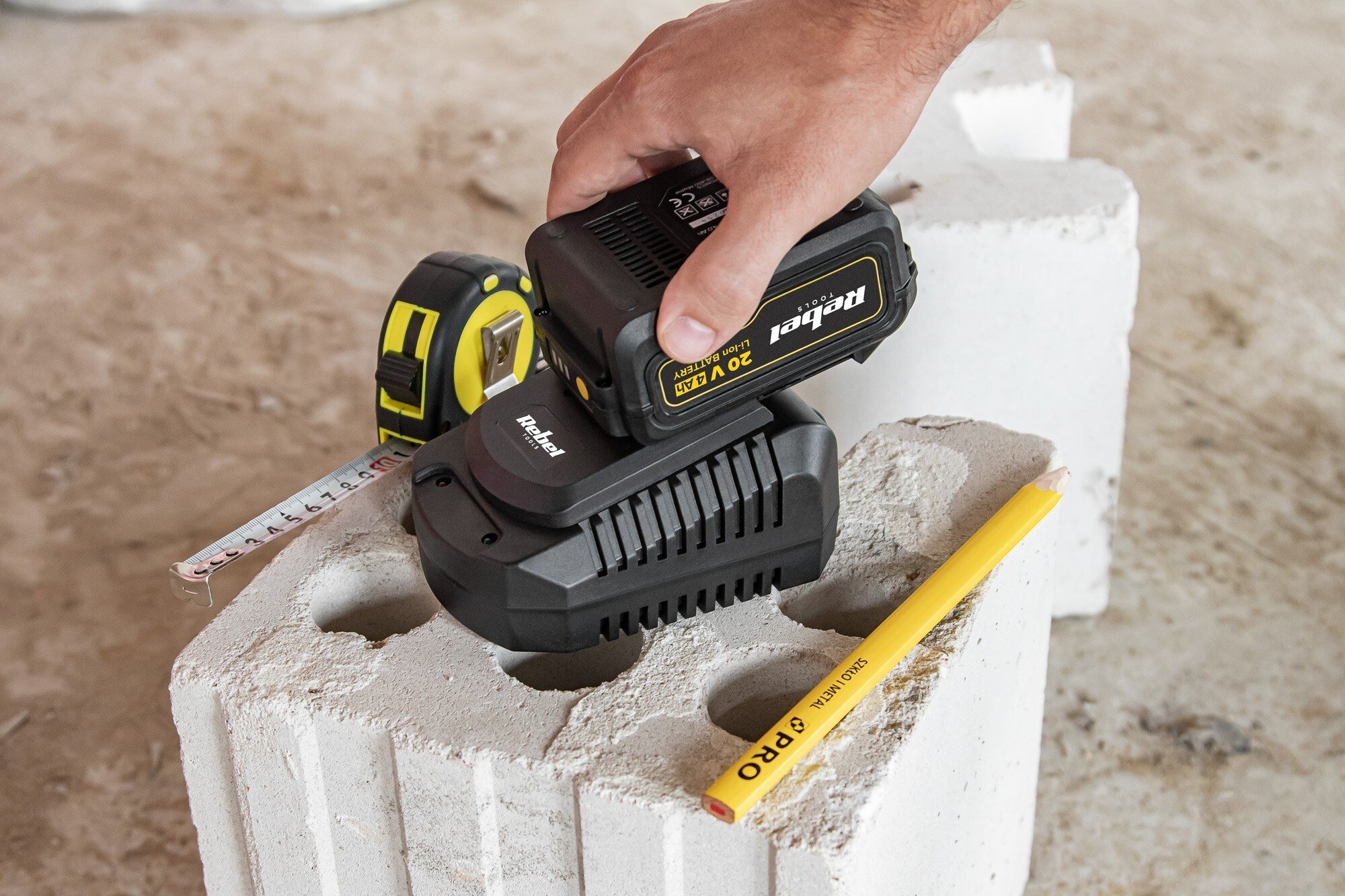 Aby ste mohli pracovať dlhšie bez toho, aby ste museli zastavovať na dobíjanie batérie, Rebel Tools ponúka aj špeciálnu 20 V batériu s kapacitou 4 Ah, ktorá účinne predĺži dobu prevádzky mnohých nástrojov, ako sú vŕtačky, fúkače, nožnice a vyžínače, ako aj priamočiare píly a kompresory. Tento prídavný akumulátor je ideálnou náhradou pri nabíjaní dodaného akumulátora. Umožní vám ešte viac sa zapojiť do vašich domácich projektov. RB1002, RB1031, RB-1059, RB-1060, RB-1061, RB-5000, RB-5001, RB-5002, RB-5003