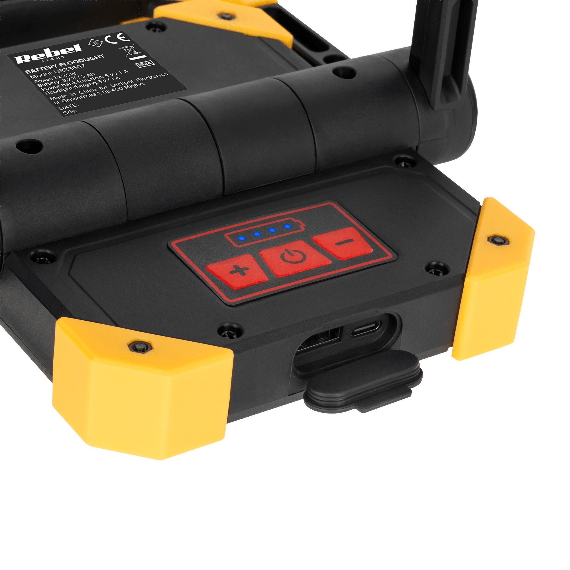 LED svetlomet 2XCOB sa vyznačuje robustnou konštrukciou s krytím IP44, vďaka čomu je odolný voči prachu a vode, a je ideálny na použitie v rôznych poveternostných podmienkach. Je vyrobený z materiálov, ktoré odolávajú teplotám od -20 ° C do 45 ° C, a ponúkajú dlhú životnosť až 20 000 hodín. Nastaviteľný magnetický držiak zaisťuje pohodlné umiestnenie svetlometu, zatiaľ čo porty USB a USB-C umožňujú ľahké nabíjanie zariadenia a samotného svetlometu, ktoré sa plne nabije až za 6 hodín. S hmotnosťou 583 g a rozmermi 129 x 170 x 51 mm je kompaktný a ľahko sa prenáša. Pre jednoduché použitie a nastavenie je súčasťou balenia kábel USB-C (55 cm) a návod na obsluhu.