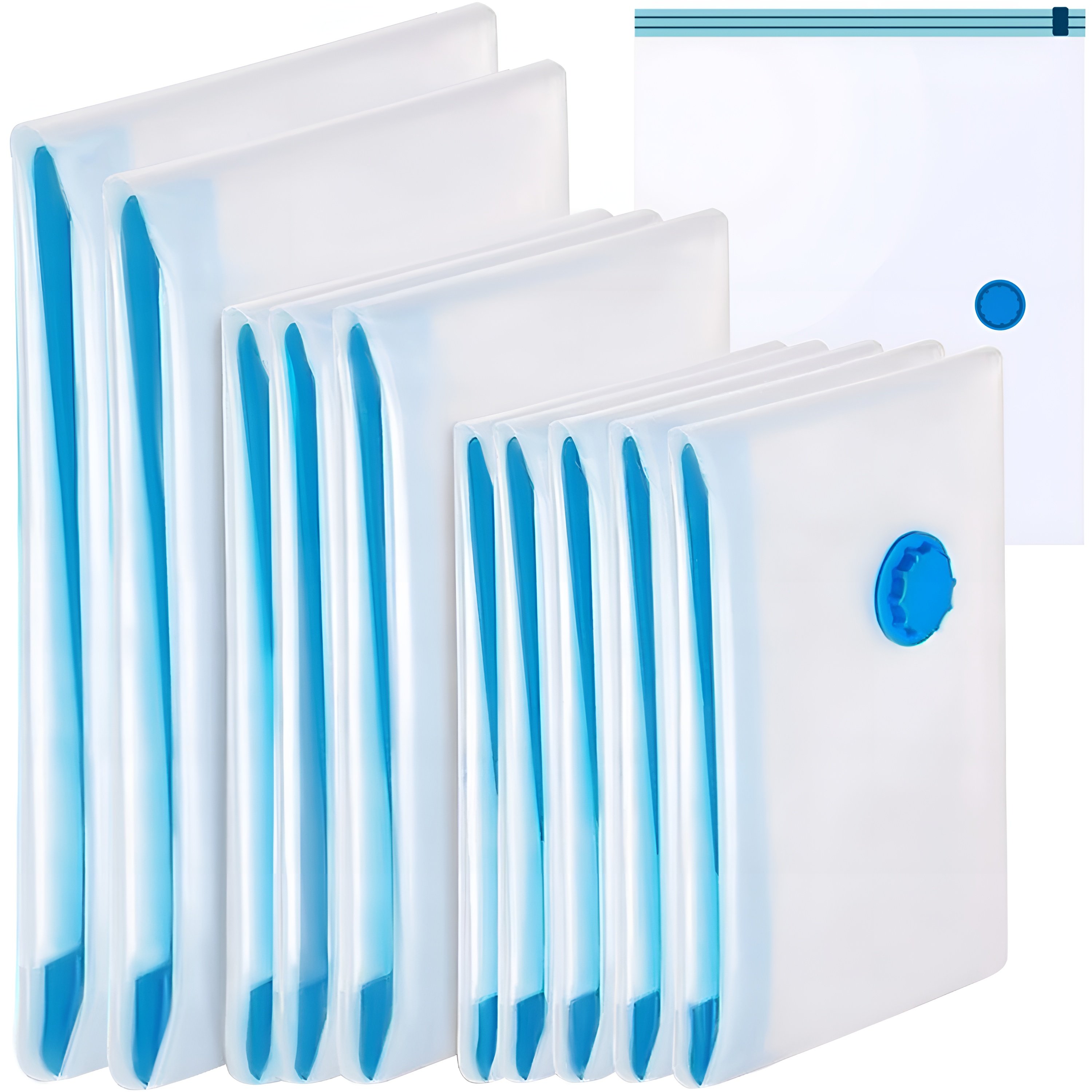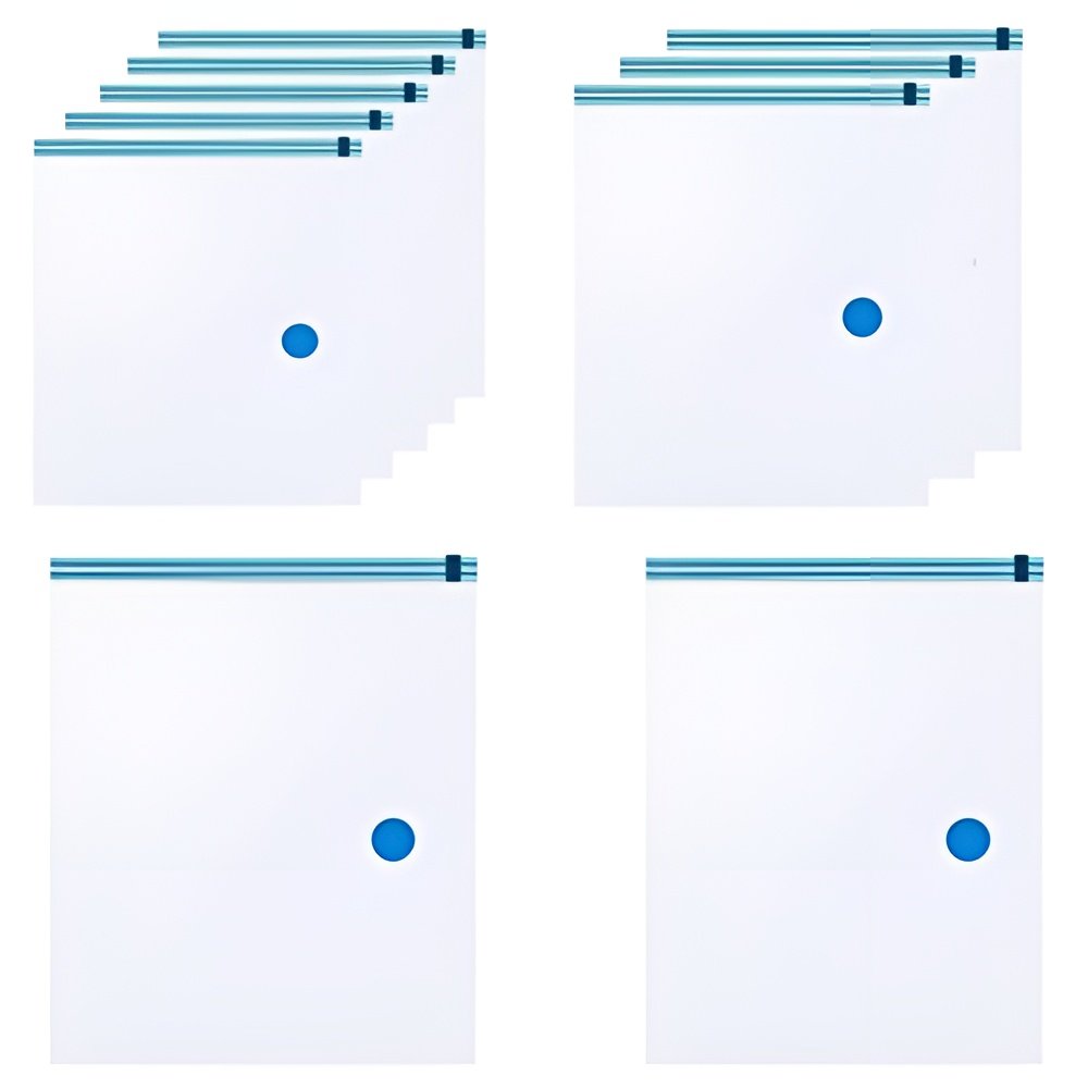 Súprava 10 vákuových vrecúšok je opakovane použiteľná. Uložené veci sú dokonale chránené proti prachu, špine, vode, vlhkosti a moliam. Oblečenie uložené bez prístupu vzduchu vyzerá dlhšie ako nové. Na odsávanie vzduchu stačí obyčajný vysávač. Naša sada vám umožní ušetriť veľa miesta.