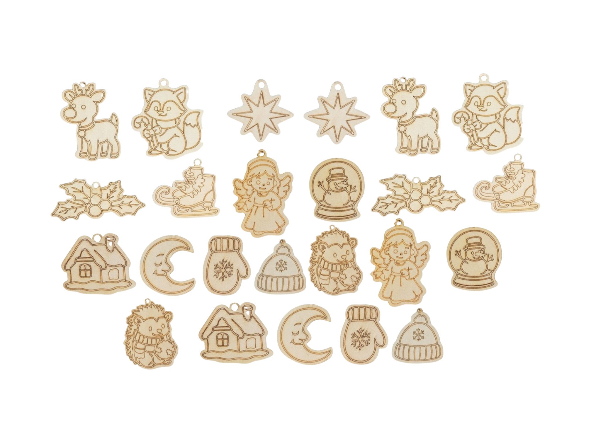 Táto sada obsahuje 24 drevených vianočných ozdôb, ktoré sú ideálne na tvorivé projekty.