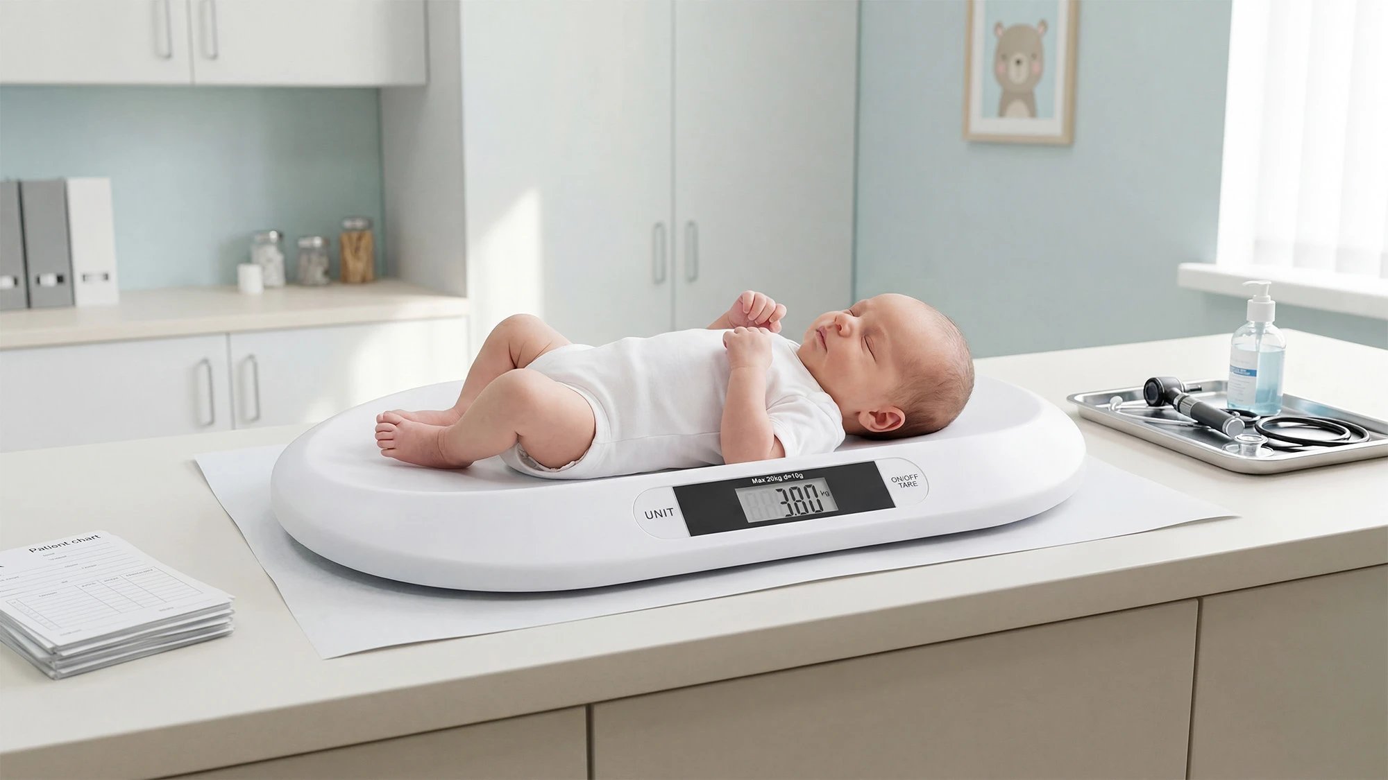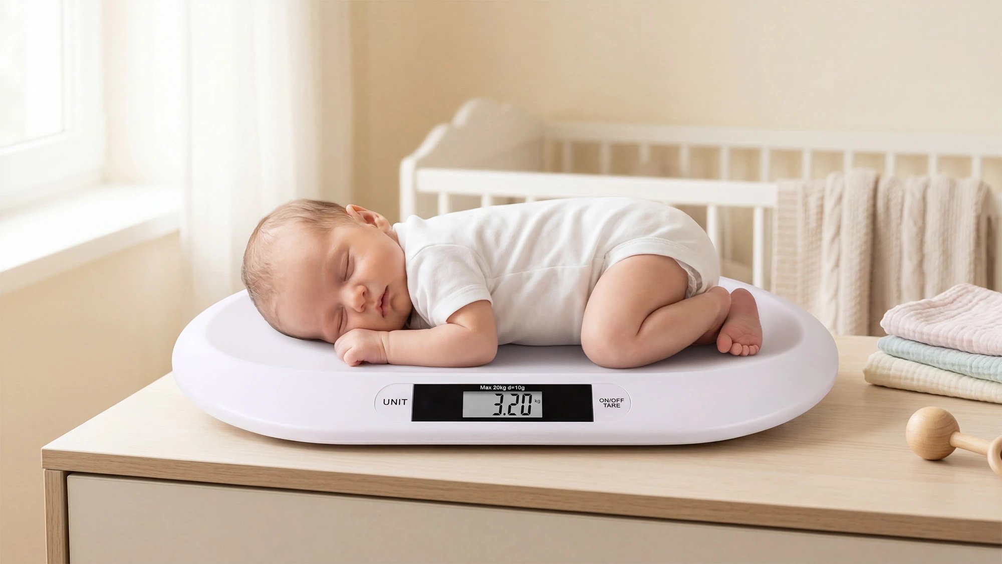 Digitálna váha pre dojčatá do 20 kg s funkciou TARE, LCD displejom a protišmykovými nožičkami.
