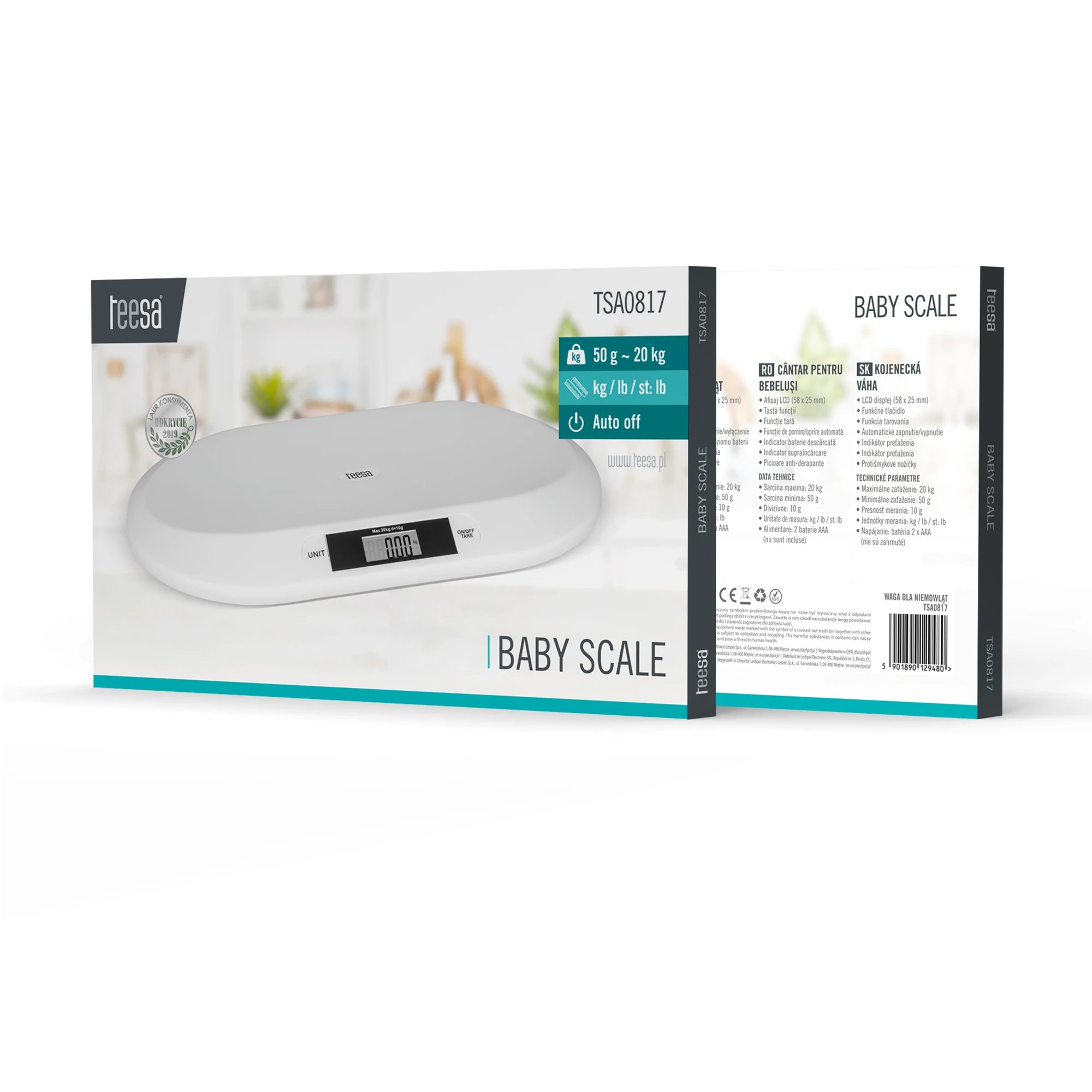 Hmotnosť zariadenia je 1,15 kg. Rozmery plošiny sú 50,6 × 23,3 cm a celkové rozmery zariadenia sú 54,8 × 32 × 3,5 cm. Teesa TSA0817 tak spája jednoduché ovládanie, čitateľný displej a praktické funkcie do kompaktného prevedenia vhodného na váženie tých najmenších.