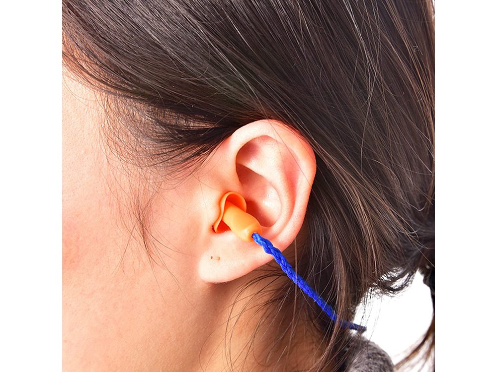 Chránič sluchu z mäkkej PU peny s bezpečnostnou šnúrkou.