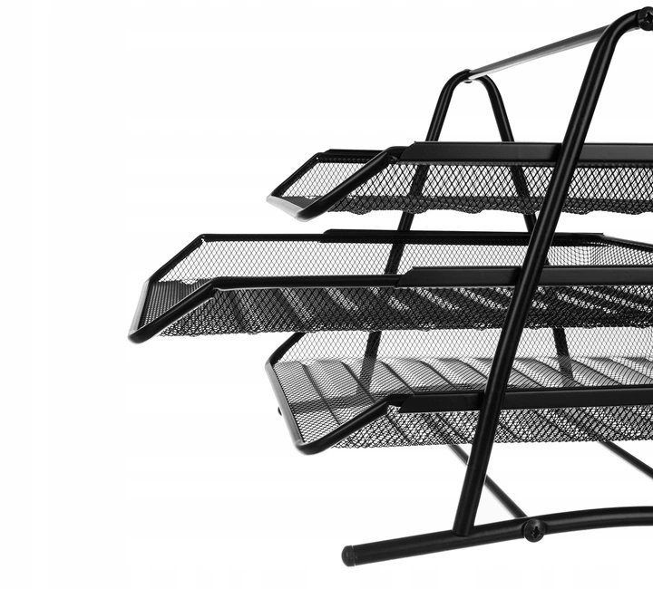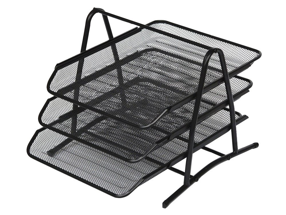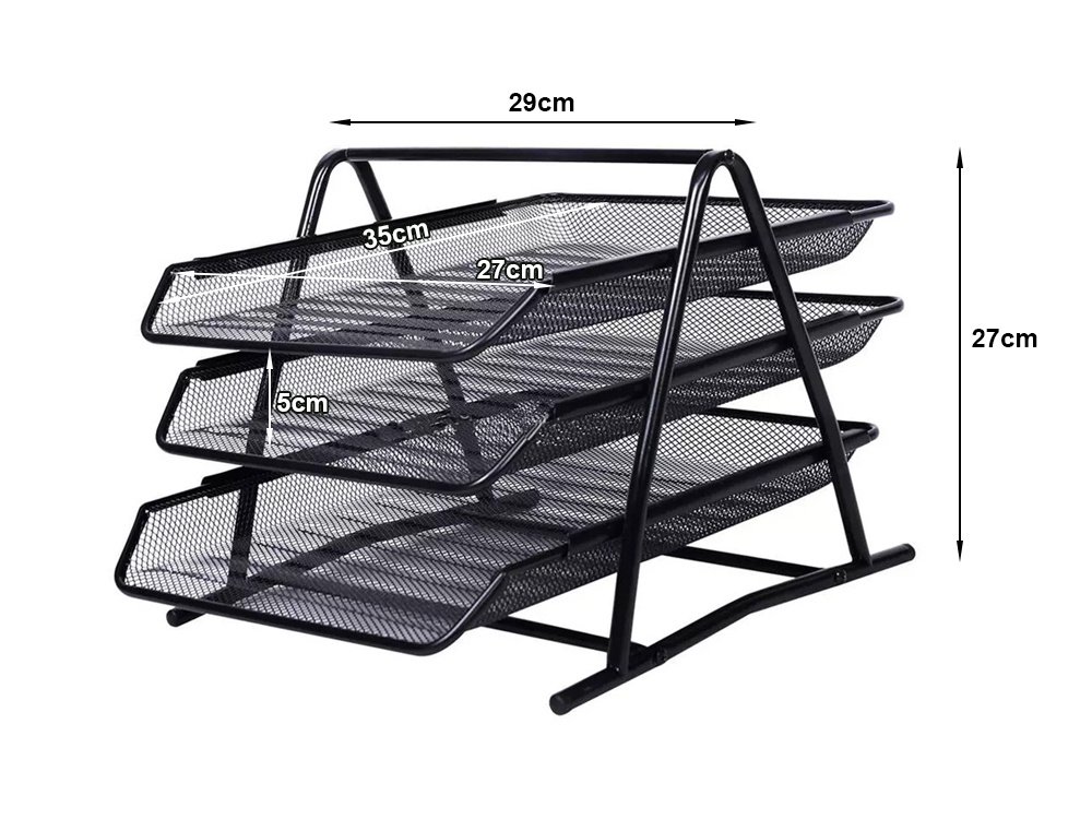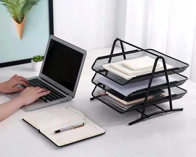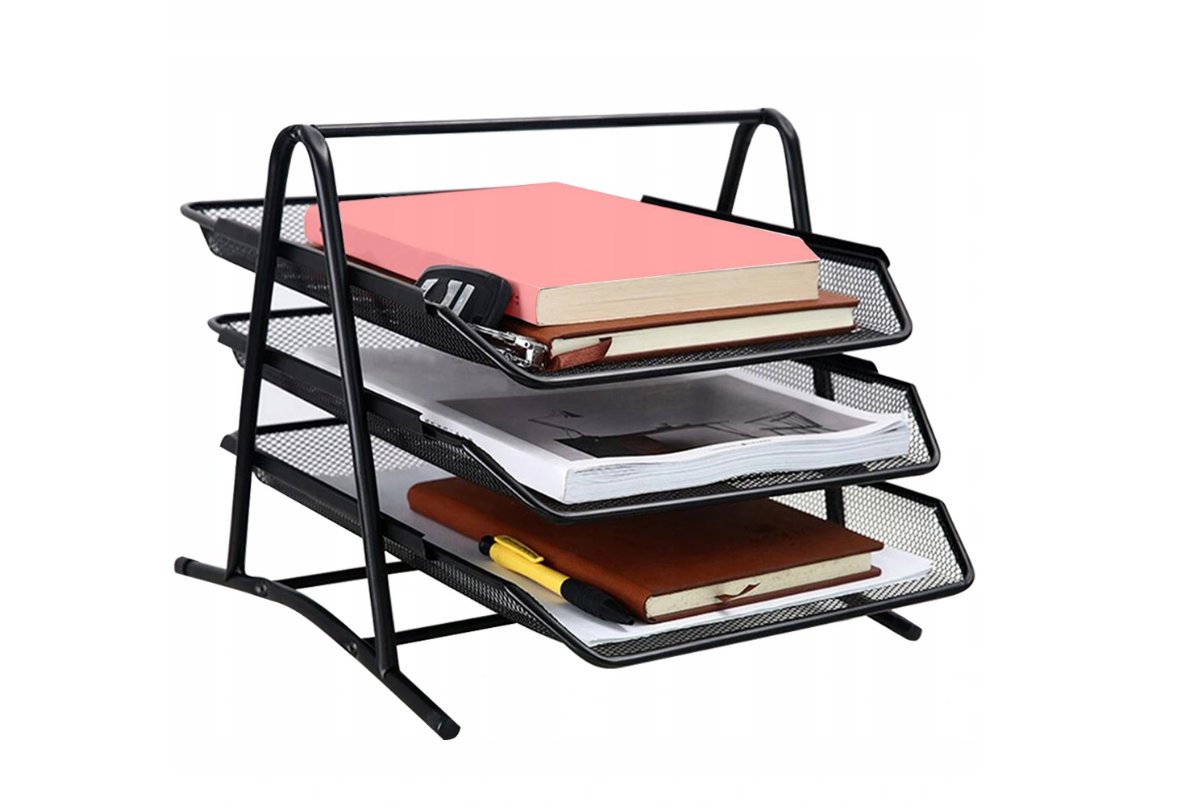 Trojposchodový drôtený odkladač na stôl. Stolový organizér na dokumenty z ľahkej sieťovej kovovej konštrukcie vám umožní mať poriadok v kancelárskych dokumentoch. Možno ho použiť na uloženie kníh a školských zošitov.