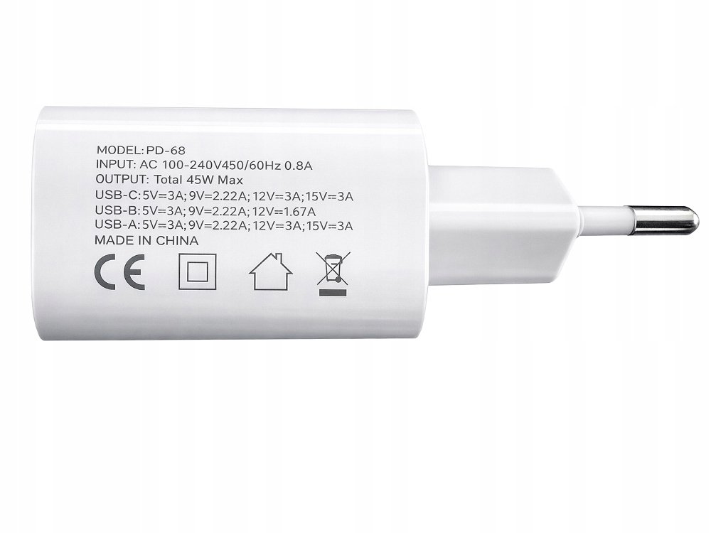 Táto moderná a efektívna 45 W nabíjačka do zásuvky s tromi nabíjacími portmi vám umožňuje nabíjať viacero zariadení súčasne. Ideálna pre domáce použitie, kanceláriu aj cestovanie.