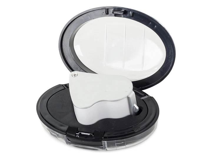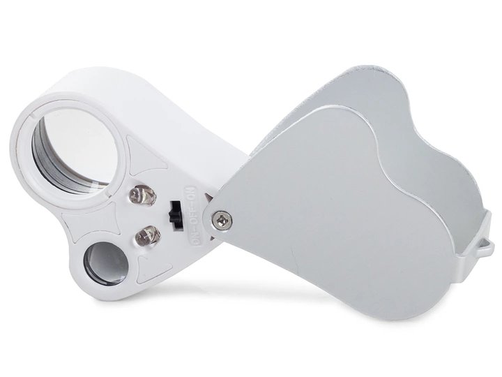 Kovová, skladacie mineralogická lupa s dvoma LEDkami. Vhodná pre určovanie minerálov priamo v teréne. Súčasťou balenia je plastová transportná krabička s čiernym elektrosametem.