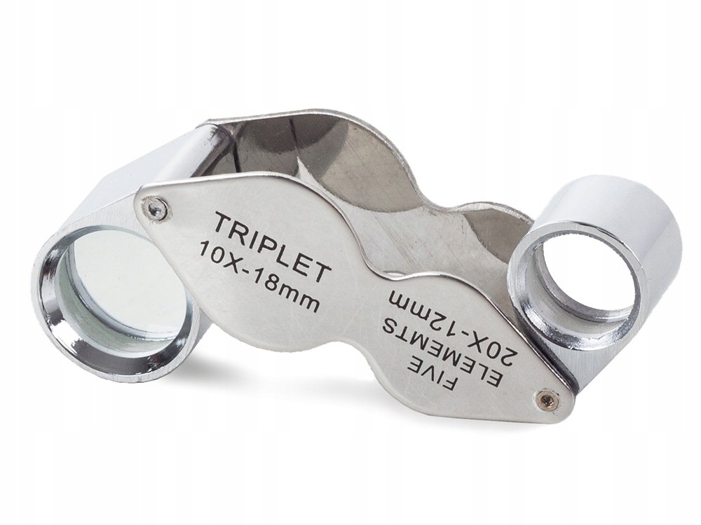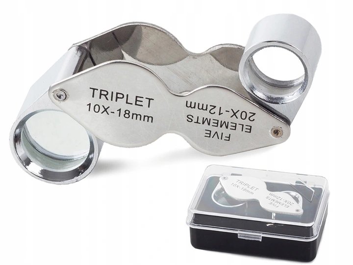 Kovová, skladacie mineralogická lupa. Vhodná pre určovanie minerálov priamo v teréne. Súčasťou balenia je plastová transportná krabička s čiernym elektrosametem.