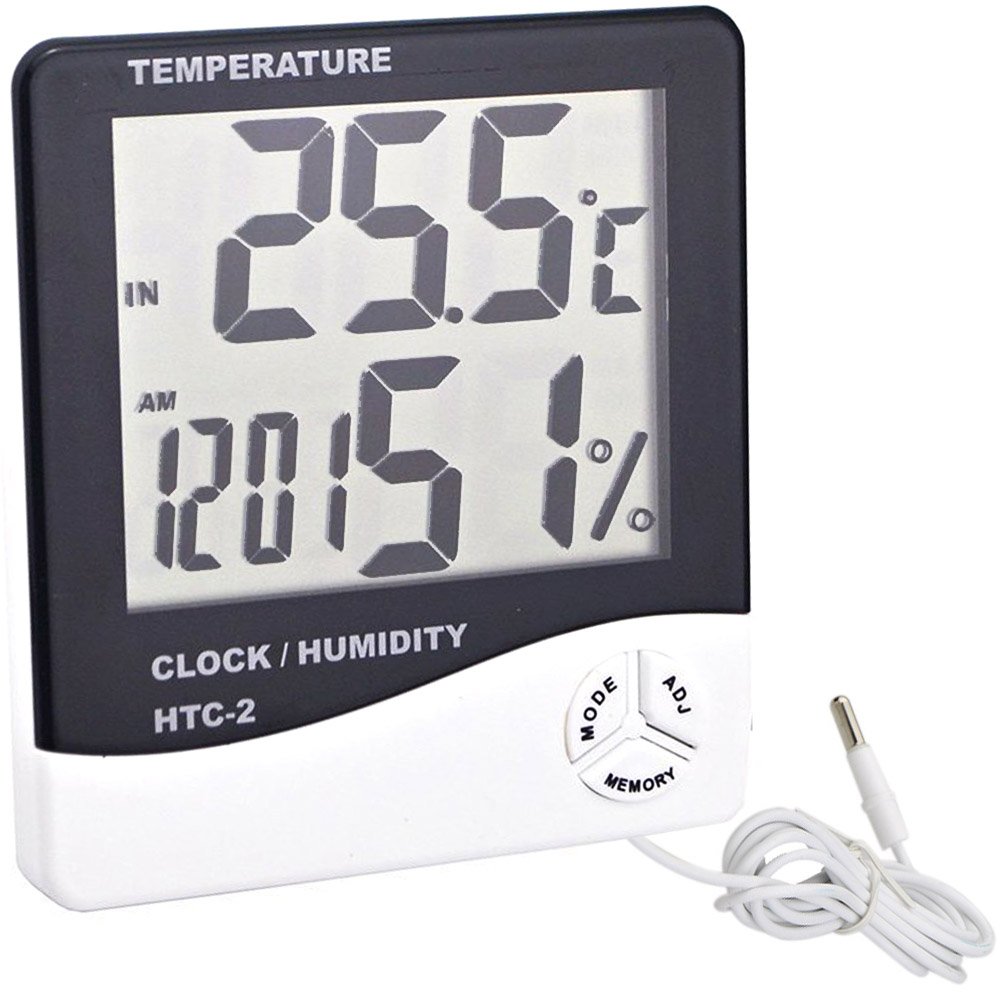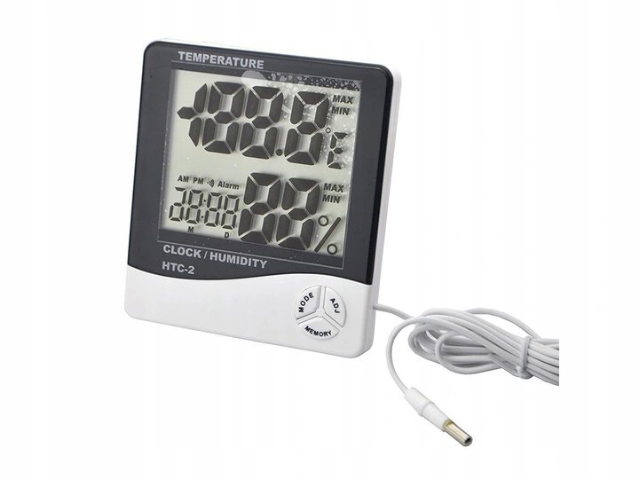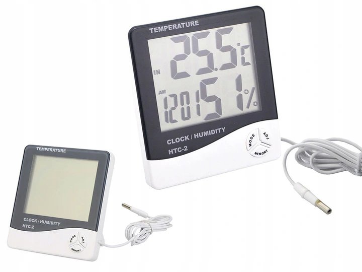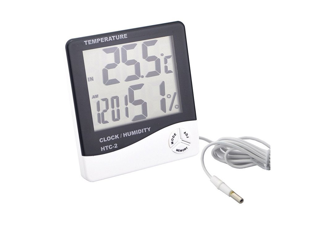 Digitálny teplomer HTC-2 s veľkým LCD displejom meracia vnútornú teplotu v miestnosti, vonkajšiu teplotu pomocou externej sondy a vnútornú vlhkosť.